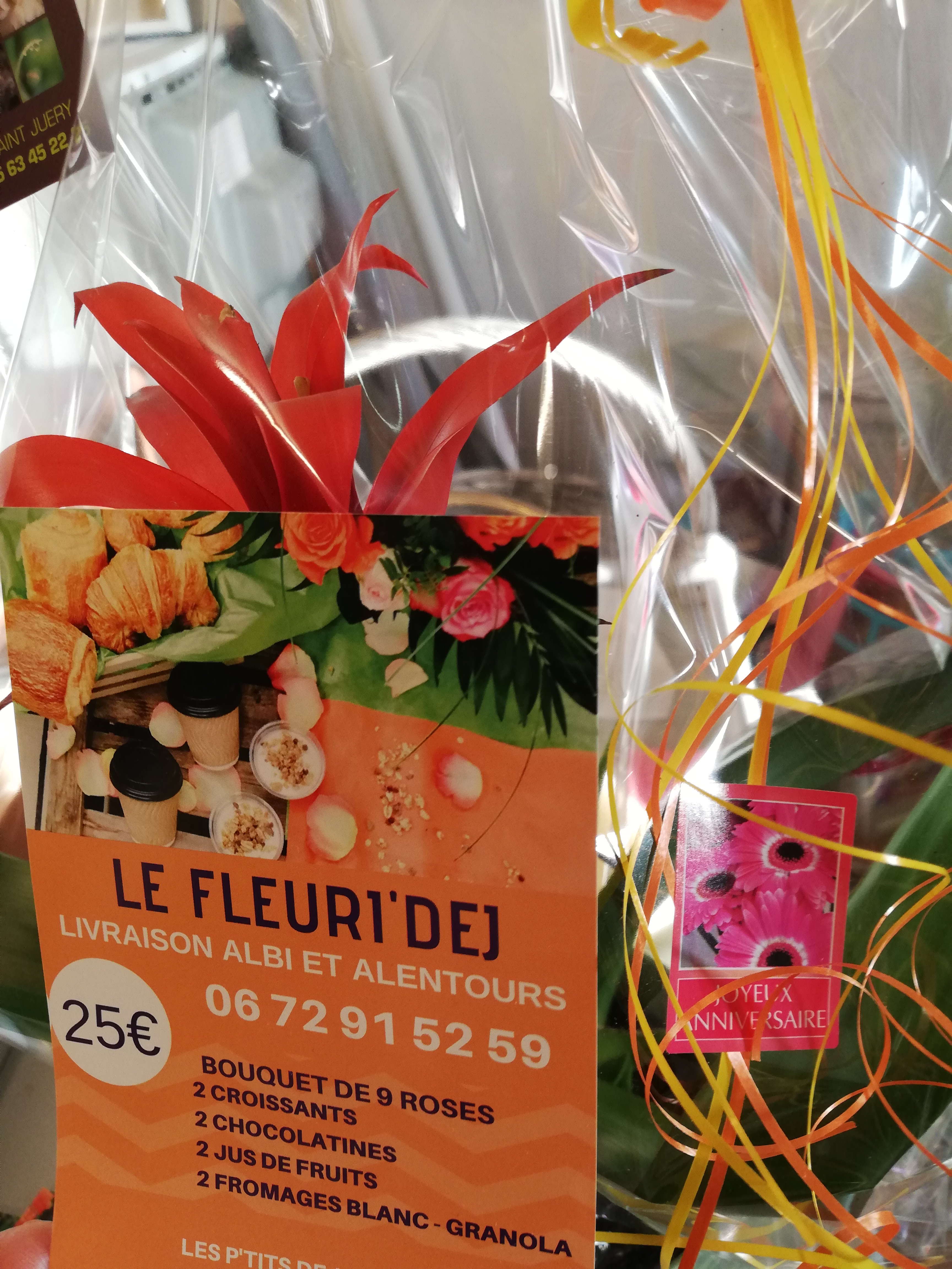 Mes parents ont eu un petit déjeuner fleuri pour l'anniversaire de ma mère. Ils ont adoré. Joli bouquet et petit-déjeuner de qualité. Je recommande vivement !
